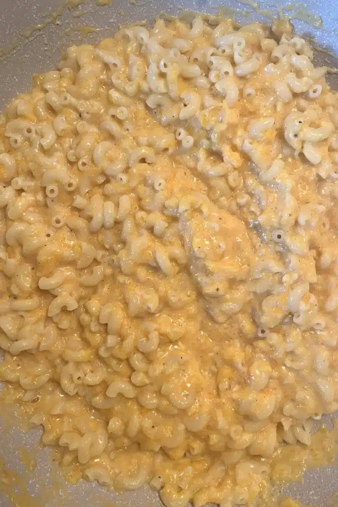 - Add the cooked macaroni to the pan and stir until well-coated.